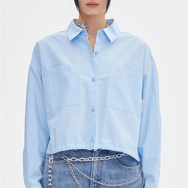 This blouse isn’t just about good looks. Its loose, oversized fit and crop length make it a trendy yet practical choice for various activities. Whether you’re heading to a brunch, a casual meet-up with friends, or simply enjoying a relaxed weekend, this blouse offers the ideal balance between style and comfort. The turn-down collar and single-breasted closure add a classic touch, while the pocket detailing provides a hint of functionality and charm.