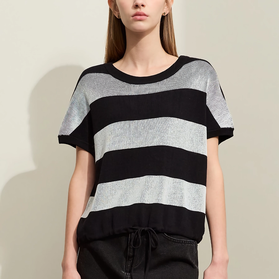 This versatile jumper features a loose fit and a striking wide striped pattern, making it a standout piece in any wardrobe. The crewneck design and raglan sleeves add a touch of classic style, while the stretchy drawstring short sleeves provide a customizable fit for maximum comfort.