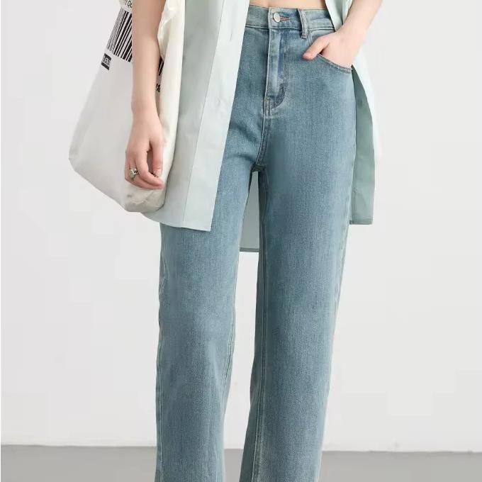 What sets these jeans apart is their impeccable fit and timeless style. The high-waisted design accentuates your waistline while the straight leg cut elongates your legs, giving you a sleek and sophisticated appearance. The fabric is both durable and comfortable, ensuring that these jeans will be a favorite for seasons to come. The moderate softness provides just the right amount of comfort without compromising on structure, making them ideal for all-day wear.