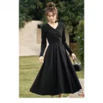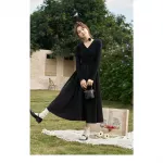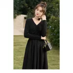 Step into the new season with grace and elegance in this stunning black knitted smocked dress. Perfect for both spring and autumn, this dress is designed to make you feel effortlessly stylish and comfortable. Its vintage-inspired A-line silhouette and V-neckline add a touch of classic charm, while the modern design elements ensure you stay on-trend.