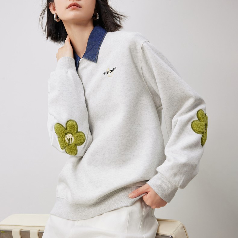 What sets this sweatshirt apart is its unique flower patchwork on the sleeves, adding a touch of femininity and charm to a classic silhouette. The solid pattern makes it versatile and easy to pair with your favorite jeans, skirts, or trousers, making it a staple in your autumn and winter wardrobe.