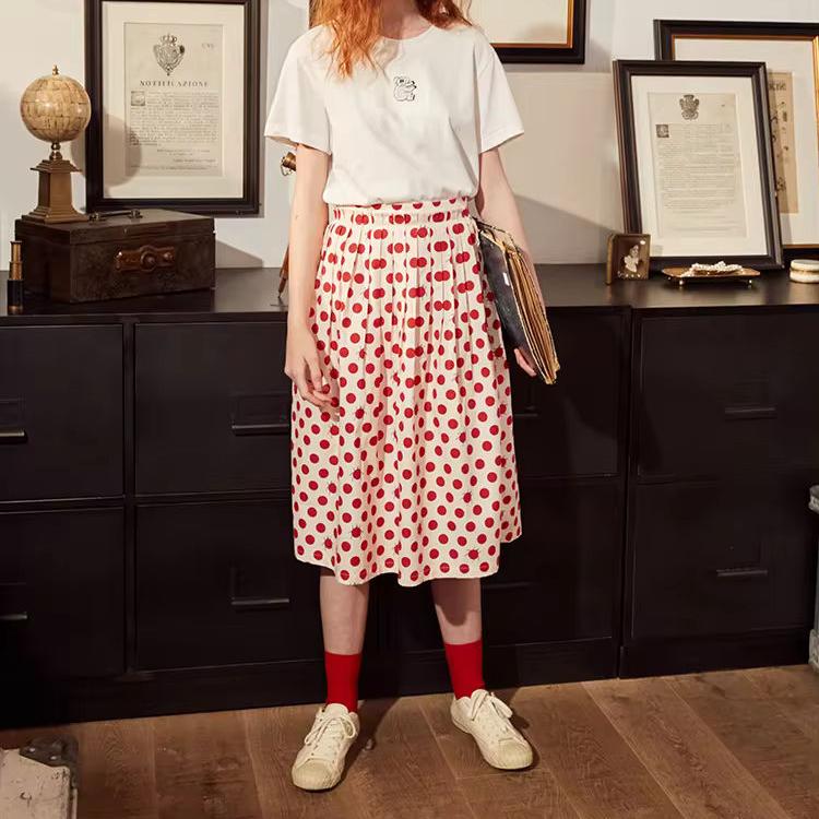 The unique combination of classic design and modern details sets this skirt apart. The polka dot print adds a fun and youthful vibe, while the button decoration provides a touch of sophistication. The high-quality cotton fabric ensures durability and breathability, making it a practical choice for everyday wear. With its flattering A-line silhouette and comfortable fit, this skirt is a must-have for any fashion-forward woman.